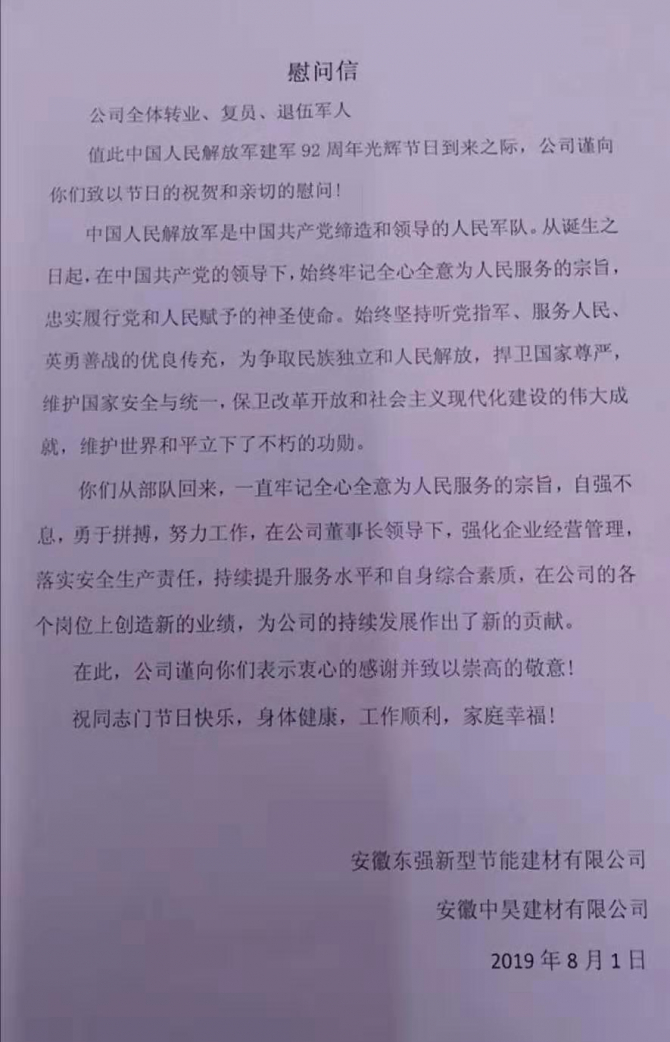 2019年8月1日迎來中國人民解放軍建軍92周年,公司全體領(lǐng)導(dǎo)、員工,向祖國最親愛的子弟兵致以衷心的祝福,同時向公司退伍軍人表達親切的慰問。